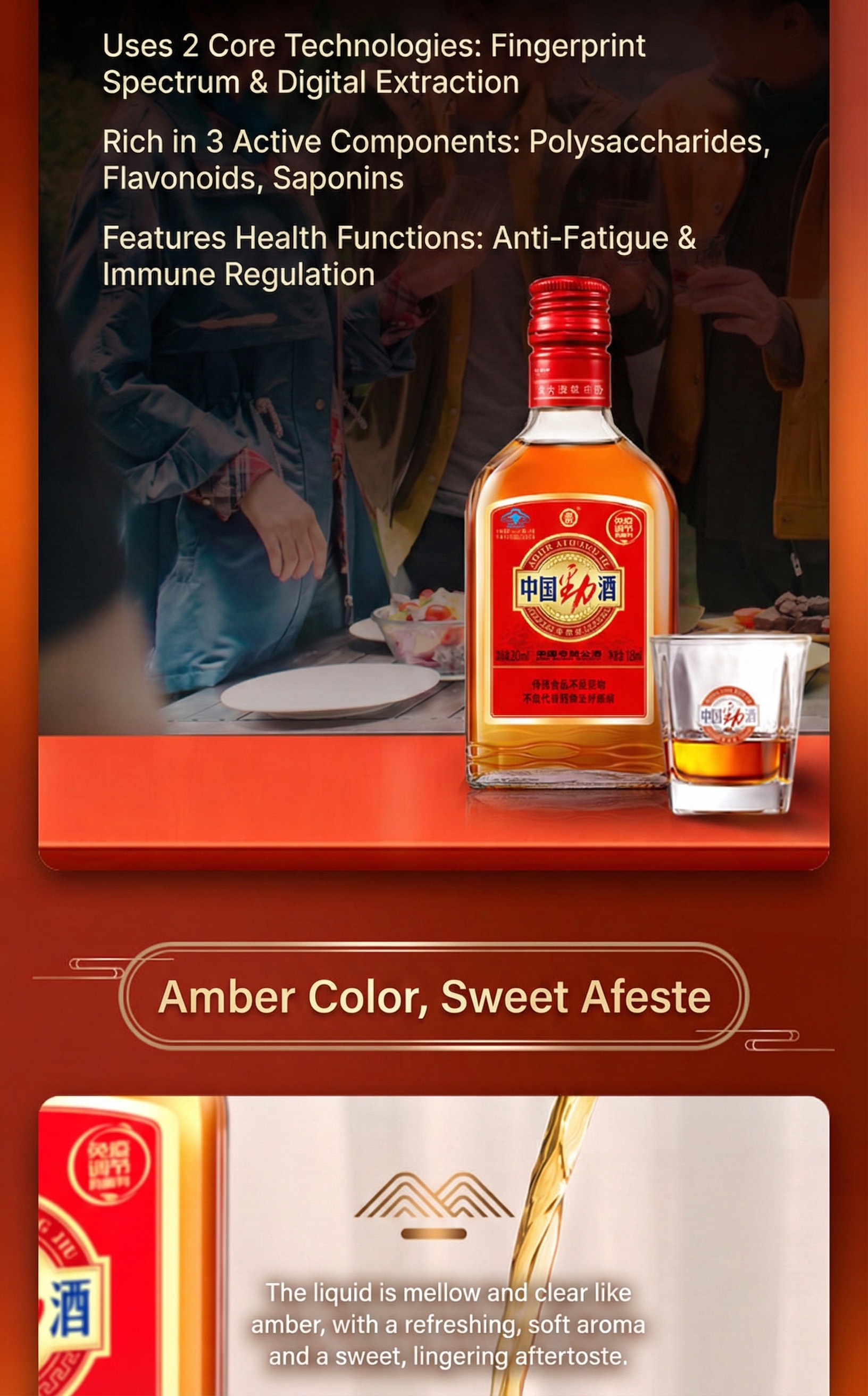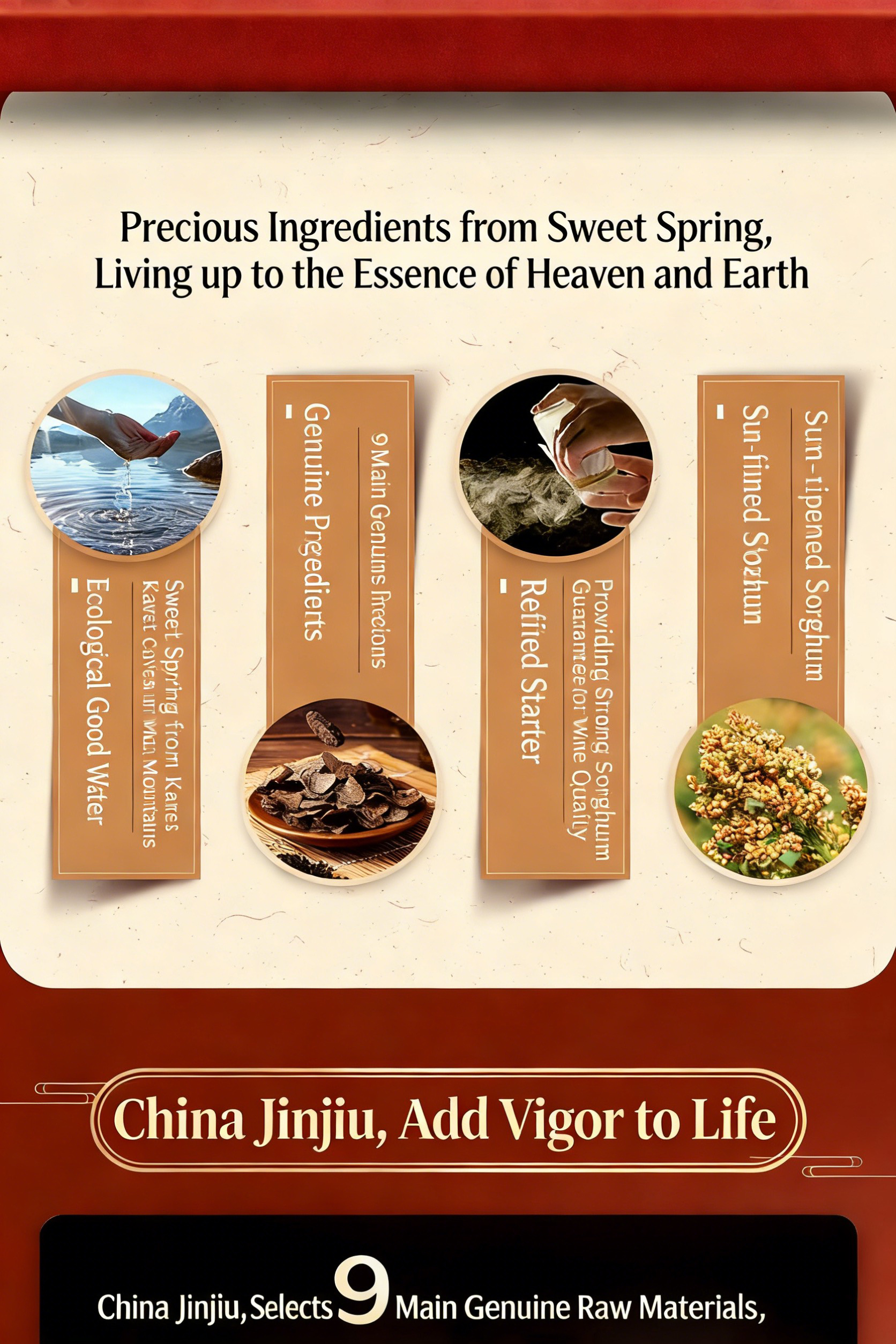35%vol JING Red主要成分:基酒(糯高粱酿制)、水、淮山药、仙茅、当归、淫羊藿、肉苁蓉、丁香等多味道地药材